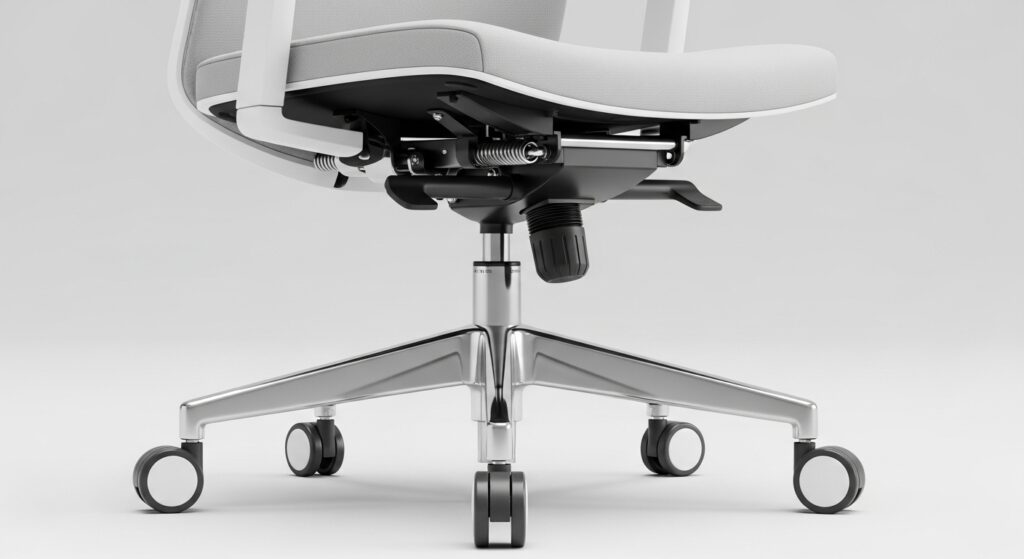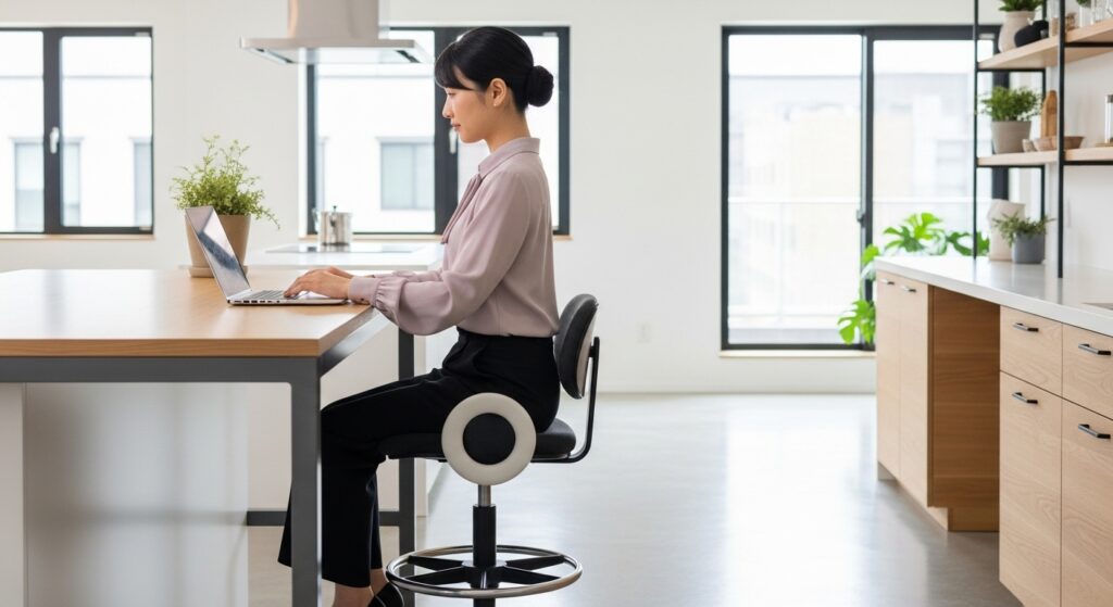 さらに、ミドルハイタイプには多くの場合、足元のリング状の「フットレスト(足置き)」の使用が前提となっていたり、最初から付属していたりします(※購入店や品番によります)。座面を高くすると足が床から浮いてしまいますが、このフットレストに足を乗せることで、太ももの裏の圧迫を防ぎ、血流を妨げない正しい姿勢をキープできるのです。