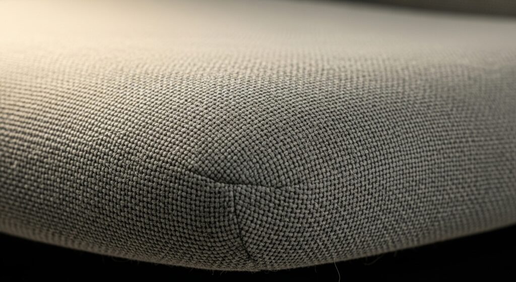 従来のオフィスチェア、特に機能性を重視したモデルは、黒い樹脂フレームや機械的な金属パーツが露出していることが多く、リビングやダイニングの一角に置くとどうしても「そこだけ会社」のような異物感が出てしまいがちでした。しかし、オプティはその課題を見事に解決しています。背もたれから座面までが柔らかなファブリック(布地)で覆われており、樹脂パーツの露出が最小限に抑えられているため、家具としての温かみを感じさせます。