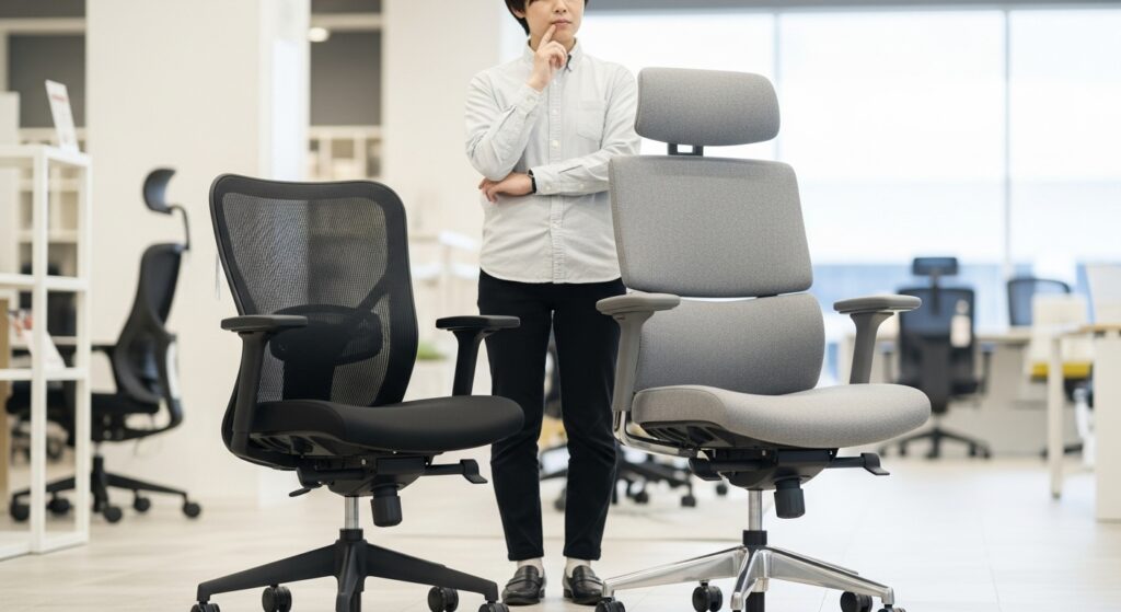 もしあなたが大柄なタイプであれば、無理にコンパクトなオプティを選ぶよりも、座面幅が広く確保されているモデルや、座面の奥行きを前後にスライド調整できる機能がついた椅子(コクヨならWizard4やMitra2など)を選んだほうが、結果的に体の負担が減り、長く愛用できるはずですよ。