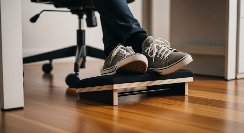 これが最も手軽で安全な方法です。床に置くタイプのフットレストですが、通常の低いものではなく、高さが30cm〜40cm程度まで上がる「ハイタイプ」のフットレストを用意してください。これを机の下に置き、そこに足を乗せます。これなら椅子の種類に関わらず、理想的な足のポジションを確保できますし、踏ん張りが効くので姿勢も安定します。