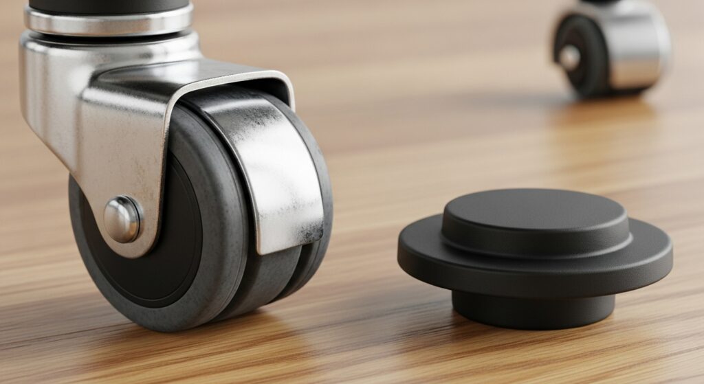 滑りやすい床ならウレタンキャスターか固定脚に換装し、転倒リスクをゼロにする。