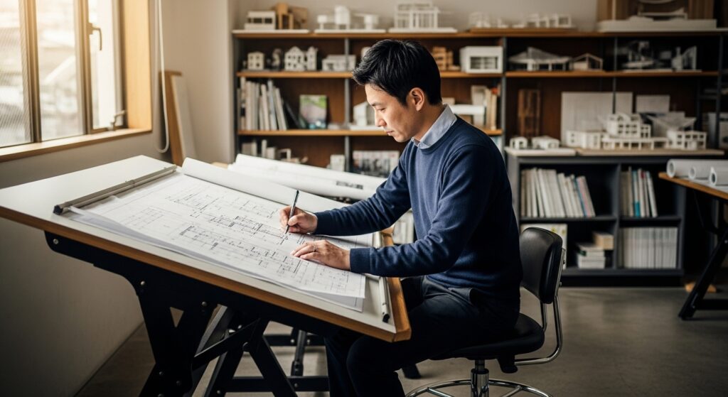 「ドラフティングチェア」という言葉、あまり聞き馴染みがないかもしれませんね。元々は建築家やデザイナーが、製図台(ドラフティングテーブル)という高いデスクに向かって作業するために開発された専用の椅子です。しかし現在、このドラフティングチェアこそが、高座面難民を救う最も実用的で、かつ現実的な選択肢となっています。
