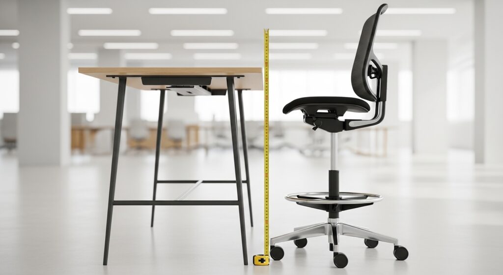 一般的なスタンディングデスクの天板高さは、日本人の体格だと概ね95cm〜105cm程度に設定されることが多いです。この高さのデスクに対して、座面高50cm程度の通常のオフィスチェアでは、まるで子供がカウンターにぶら下がっているような状態になり、仕事になりません。キーボードを打つために肩を不自然に持ち上げる必要があり、これが深刻な肩こりの原因になります。