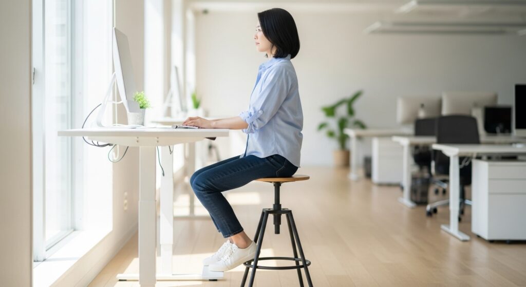 この環境で求められるのは、「どっしりと座る」ことよりも、「半立位(パーチング)」と呼ばれる姿勢です。これは、お尻を座面の端に軽く預け、両足で体重の一部を支えるという、立ち姿勢と座り姿勢の中間的なポーズです。この姿勢を取ることで、腰椎の自然なカーブを維持しつつ、下半身への負担を劇的に軽減できます。