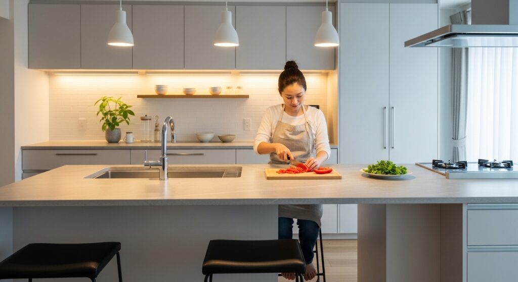 オフィス以外で「座面高60cm以上」のニーズが最も熱いのが、実はキッチンです。「料理の下ごしらえや皿洗いの最中、ちょっと腰掛けたい」「年齢とともに長時間の立ち仕事が辛くなってきた」という声は非常に多いですね。
