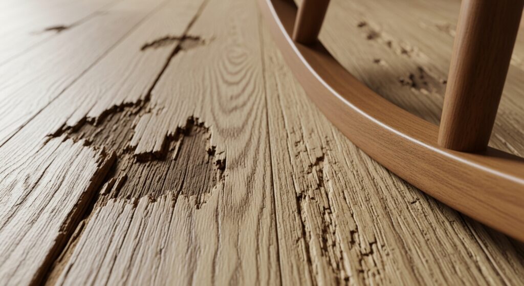 これを何の対策もせずにフローリングで直置きして使うと、あっという間に表面のコーティングが剥がれ、深い凹みや無数のひっかき傷ができてしまうんです。