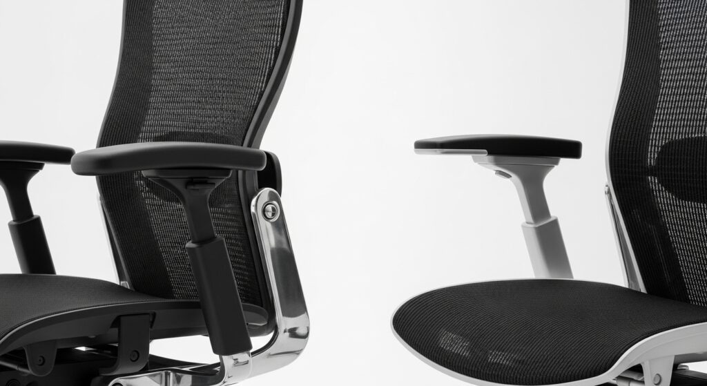 品番が見えない場合、アームレスト(肘掛け)の支柱部分を見てください。初代は少し丸みを帯びた有機的なラインを描いていますが、セコンダはより直線的で、ガッシリとした太いデザインに変更されています。これは、海外の体の大きなユーザーが体重をかけてもびくともしないよう、強度基準(BIFMA X5.1など)をクリアするために肉厚が見直された結果なんです。