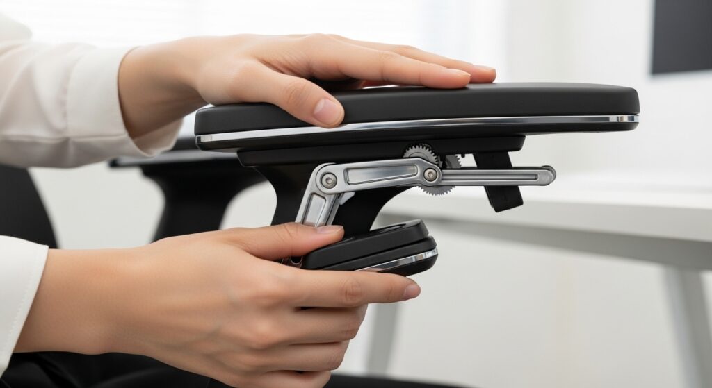 コンテッサセコンダの大きな魅力の一つにして、初代からの最大の進化点が「4Dアームレスト」です。上下、前後、左右、そして角度(首振り)の4方向に調整できるこの機能は、キーボード入力、スマホ操作、読書など、あらゆる姿勢に肘置きを追従させることができる優れものです。